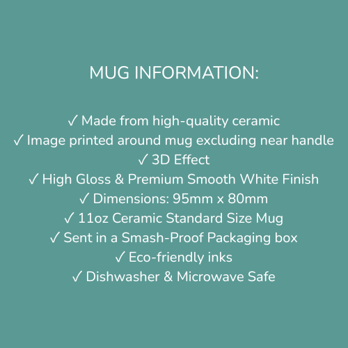 These mugs are printed by me in my workroom in Norfolk, UK. The design is printed using the latest dye sublimation process and then pressed onto the mug. This gives an amazing high quality permanent finish which is extremely scratch and fade resistant. The end result is a high-definition print with an extremely intricate level of detail. Please note, although these mugs can be washed in the dishwasher, to ensure longevity of the design we recommend they are hand washed.